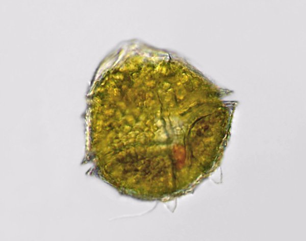 Es ist Peridinium bipes, eindeutig erkennbar an den beiden Zipfeln am Ende der Zelle. Ich habe diese Art bisher nur im Pillerseemoor und in unserem Gartenteich gefunden. Könnt Ihr evtl. von Funden berichten?