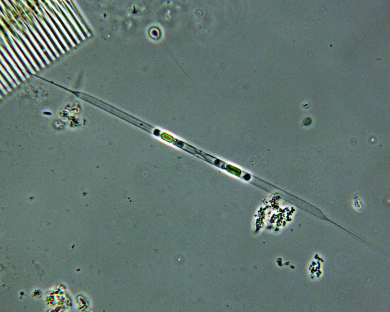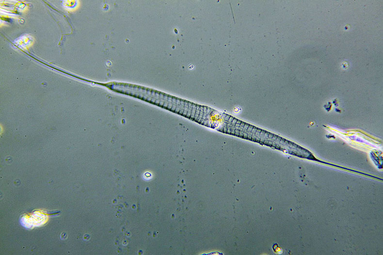 In zahlreichen Kompendien über planktische Algen, sei es HUSTEDT, NYGAARD oder STREBLE/KRAUTER usw., findet man stets die Abbildungen der Kieselalgen Acanthoceras (ehem. Attheya) zachariasii und Rhizosolenia longiseta. Viele „Tümpler“ nehmen das zur Kenntnis, haben aber selbst noch kein Exemplar gesehen. Also Raritäten? Keineswegs, beide Arten sind sogar relativ häufig. Des Rätsels Lösung: Ihre Schalen sind äußerst dünn und hyalin. Daher sind sie im normalen HF nicht zu erkennen. Man benötigt schon mindestens Phako oder sogar DIC. Acanthoceras wurde hier im Forum schon einmal von Bernd gezeigt. Meine Bilder sollen daher eine Ergänzung sein.