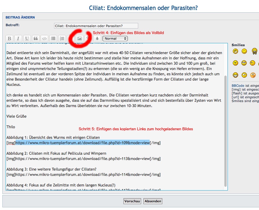 Nun fügt man den kopierten Link zwischen dem Bildplatzhalter [ img ]-> HIER <-[ /img ] im Text ein. Fertig!